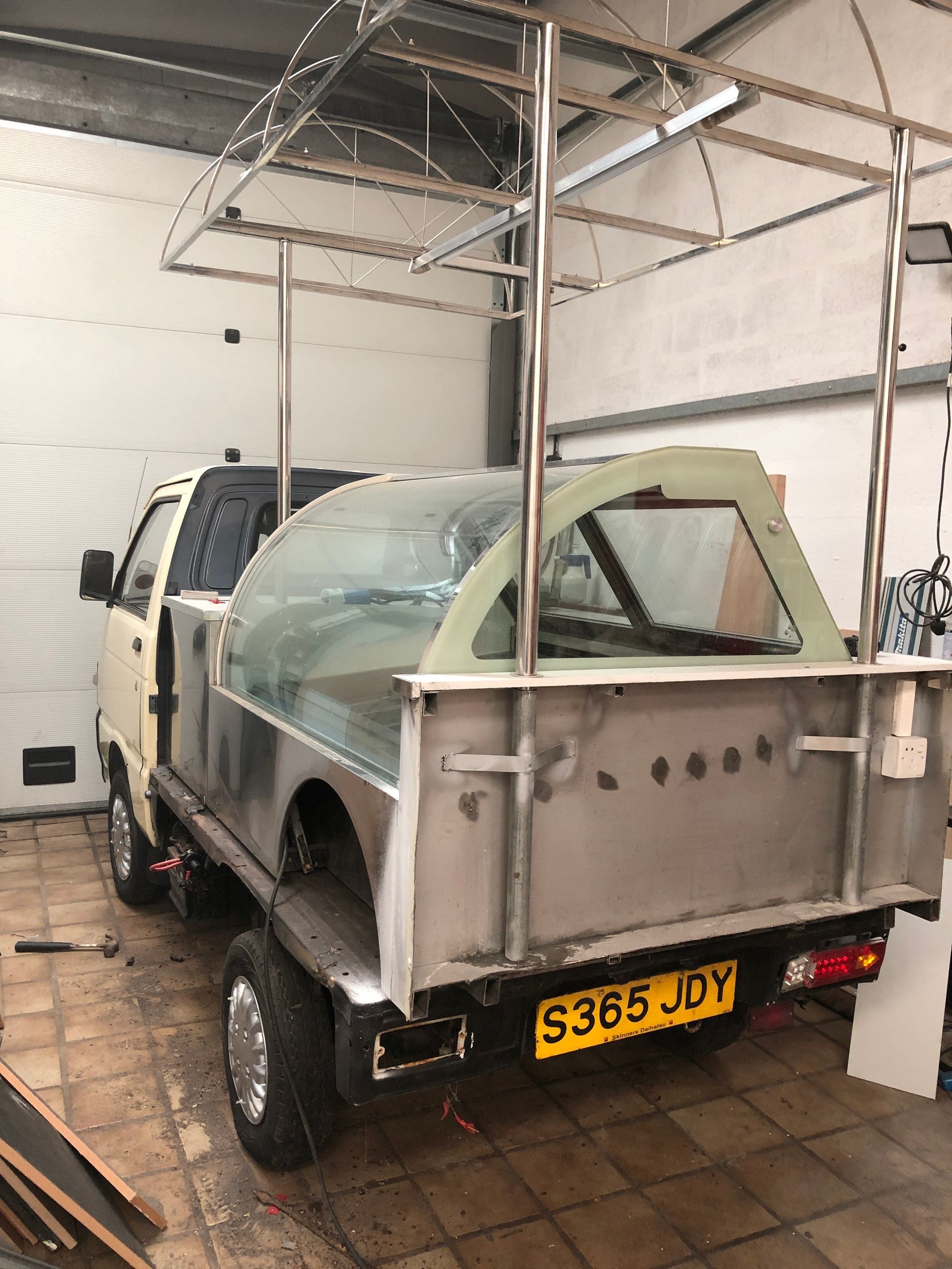 What do you get if you take an old ice cream cart and a Bedford rascal flat back pick up.. leave it with someone creative and let them loose...